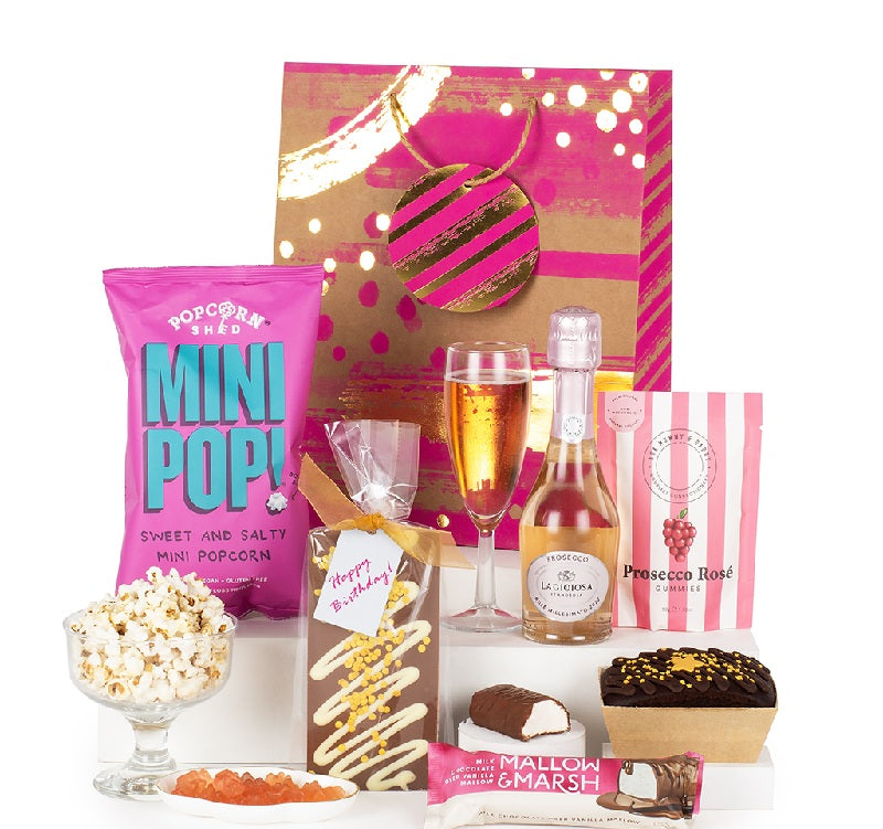 Enjoy the Popcorn Shed Mini Pop! Sweet and Salty with a refreshing sip of La Gioiosa Rose Millesimato Prosecco to toast the occasion. All presented neatly in a birthday gift bag.