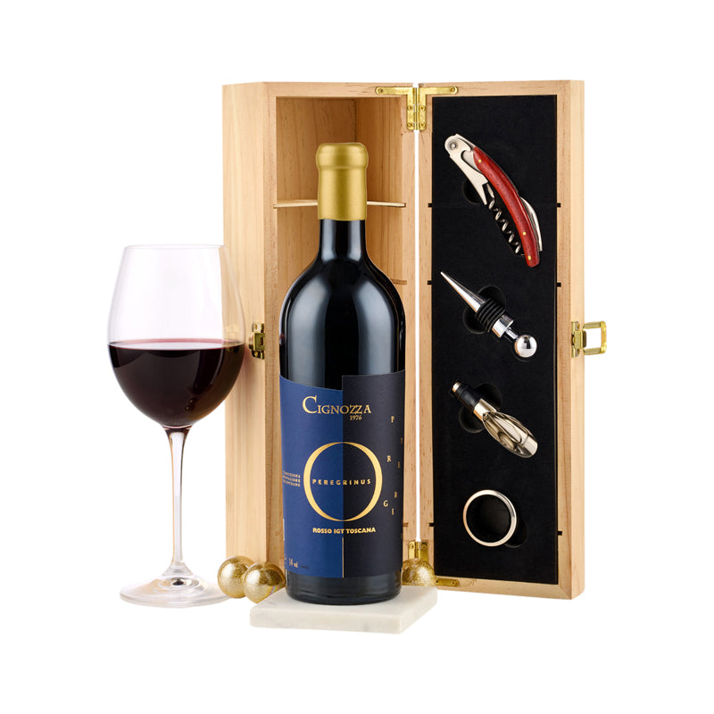 Experience the pinnacle of Italian craftsmanship with this Super Tuscan Wine & Accessories Gift Box, an exquisite selection designed for the true connoisseur. At its centre is the Cignozza Peregrinus Toscana (75cl), a distinguished Super Tuscan that captures the essence of one of Italy’s most iconic wine regions. Intensely rich and beautifully structured, it reveals layers of ripe dark fruit, delicate spice, and a luxuriously smooth, velvety finish. This is a wine made to be savoured slowly—an invitation to indulge, appreciate, and enjoy every lingering note.