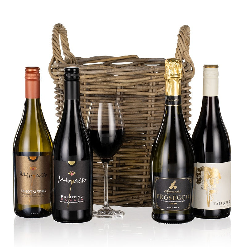 Delight the wine lover in your life with the Four Wines in a Wicker Hamper, an elegant and festive gift crafted to impress. This sophisticated selection brings together a quartet of wines that showcase a harmony of bold reds and refreshing whites, beautifully presented in a traditional wicker basket.