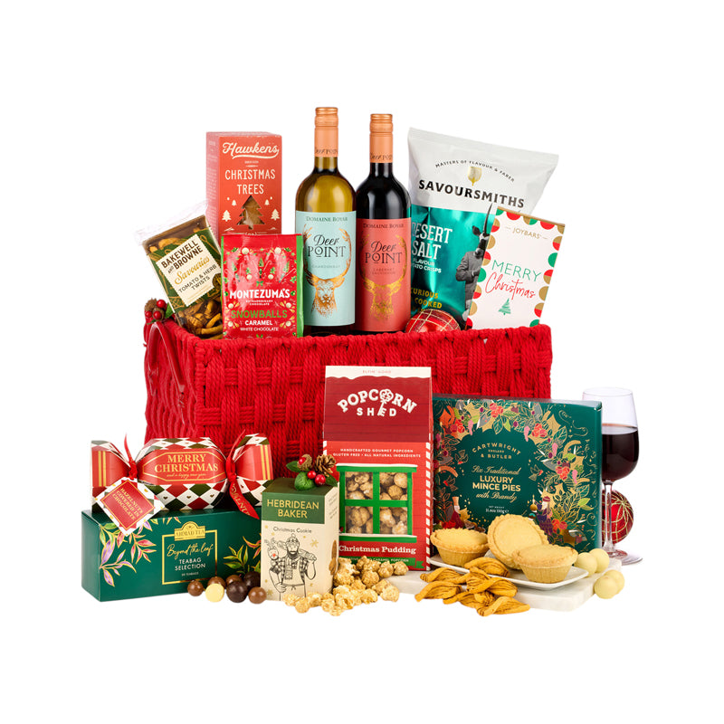 Brimming with flavour, sparkle, and festive cheer, The Merry & Bright is a showstopping hamper for those who love to celebrate in style. Presented in a large red rope basket, this generous collection pairs fine wines with a treasure trove of sweet and savoury seasonal favourites – the perfect centrepiece for Christmas gifting or entertaining.