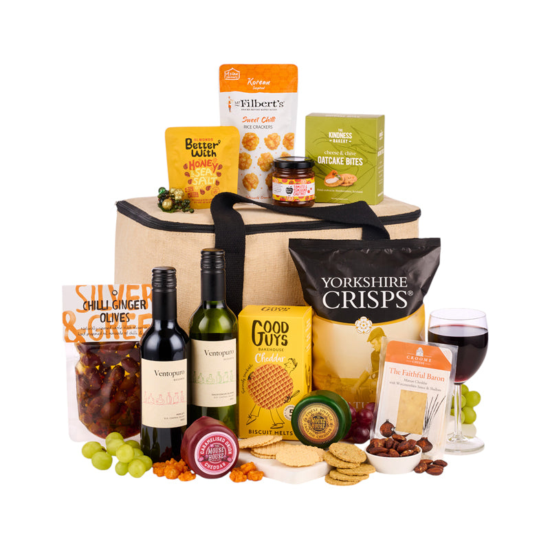 A selection of cheese, snacks, chutney and wine delivered in a re-usable cool bag.