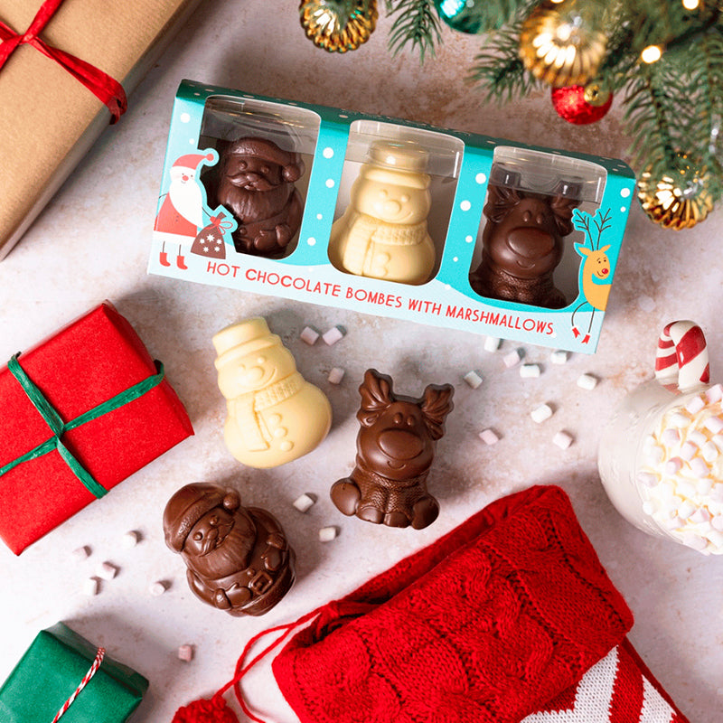 Three Christmas character hot chocolate bombes with mini marshmallows hidden inside.