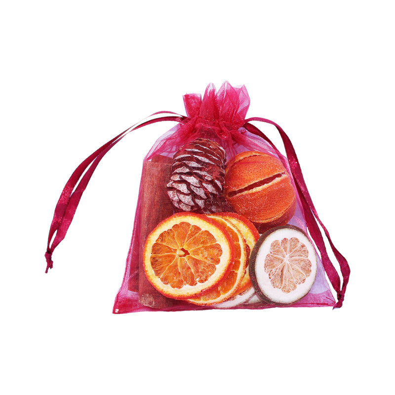- 10% organza bag, 80% dried fruits, 10% cinnamon sticks