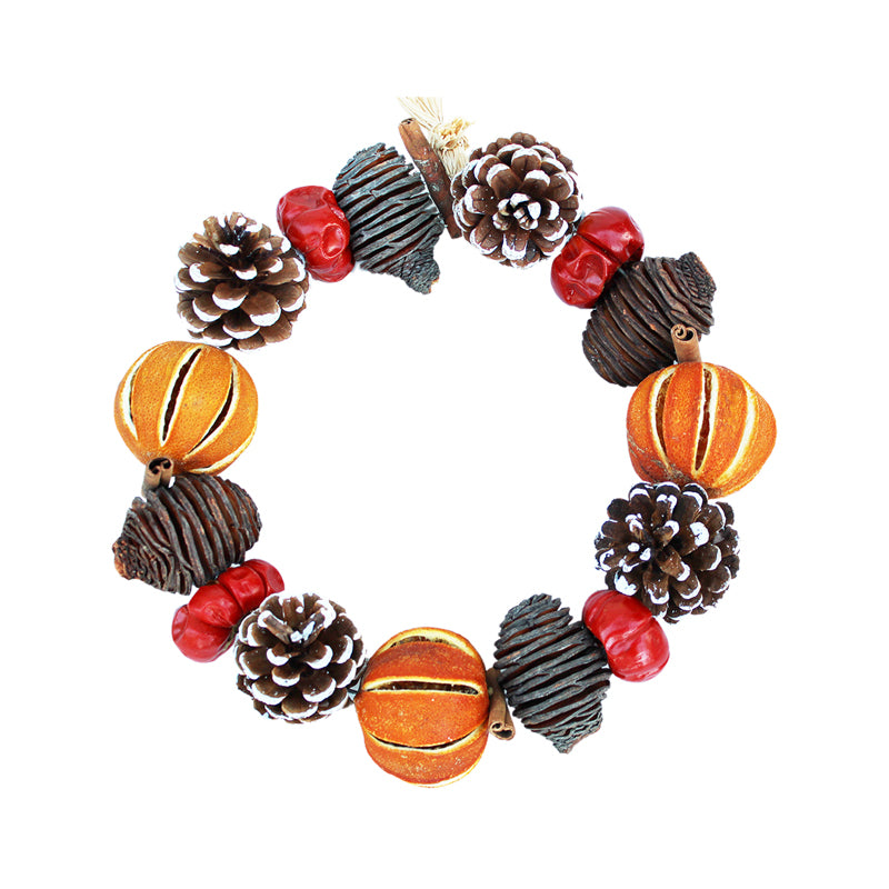 • 10% metal wire, 10% raffia, 40 % cones, 30% dried fruits, 10% cinnamon sticks