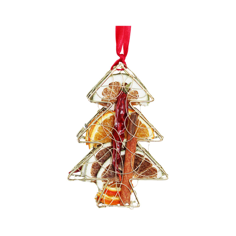 Each christmas tree shaped cage, made out of, gold mesh, is filled with, dried chillies, orange slices, and cinnamon sticks. Infused with ‘Christmas in a Bottle’ oil, it brings the nostalgic scent of Christmas into any home.