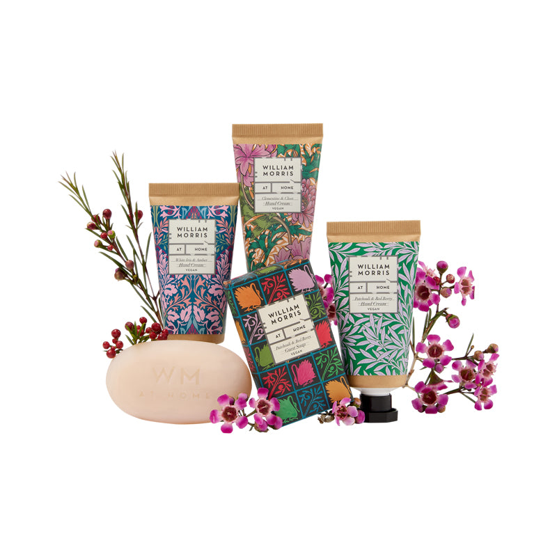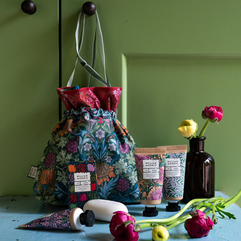 The gift pouch consists of  William Morris Sunflower print and finished with elegant moss green velvet ribbon closure, the small make-up bag contains three travel-sized hand creams and a guest soap with three signature fragrances. There’s balancing Patchouli & Red Berry, spicy White Iris & Amber and festive Clementine & Clove.