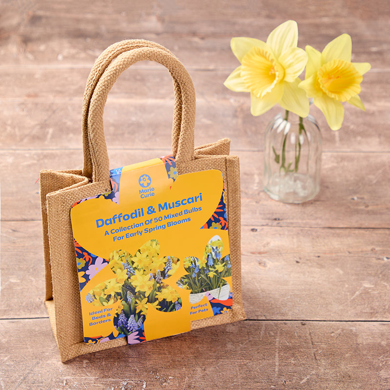Made exclusively for Marie Curie is this lovely Daffodil & Muscari blubs in a jute bag.