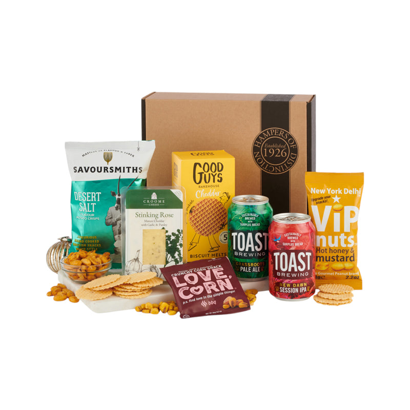 At the heart of this hamper are two exceptional craft beers: Toast New Dawn Session IPA and Toast Grassroots Pale Ale, both in 330ml bottles. The New Dawn Session IPA delivers a refreshing, citrus-led character, while the Grassroots Pale Ale offers a perfectly balanced combination of hoppy brightness and gentle malt sweetness—ideal for unwinding on a sunny afternoon or raising a toast to a special occasion.