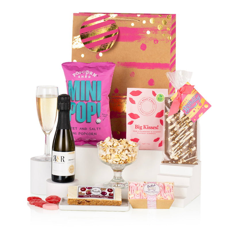 Celebrate any birthday in style with Birthday Bliss — a charming gift bag filled with sweet surprises. Inside awaits a mini Robert & Reeves Prosecco, crunchy Popcorn Shed Mini Pop!, a rich Stas Milk Chocolate Bar, and a British Bakes & Cakes Raspberry & White Chocolate Mini Loaf Cake. Finished with Ask Mummy & Daddy Big Kisses Sweets and a classic Bramble Foods Cherry Bakewell Flapjack, it’s the perfect pick-me-up to make their day extra special. A joyful, ready-to-gift treat for birthdays big or small.