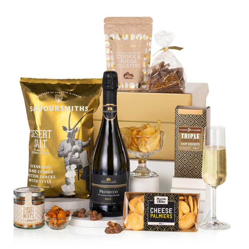 Celebrate in style with Let’s Celebrate — a luxurious gold gift box filled with Montecampo Prosecco, gourmet nuts, cheese palmiers, crisps, biscuits, cookie clusters and honeycomb chocolate. A sparkling, all-round gift for any joyful occasion.