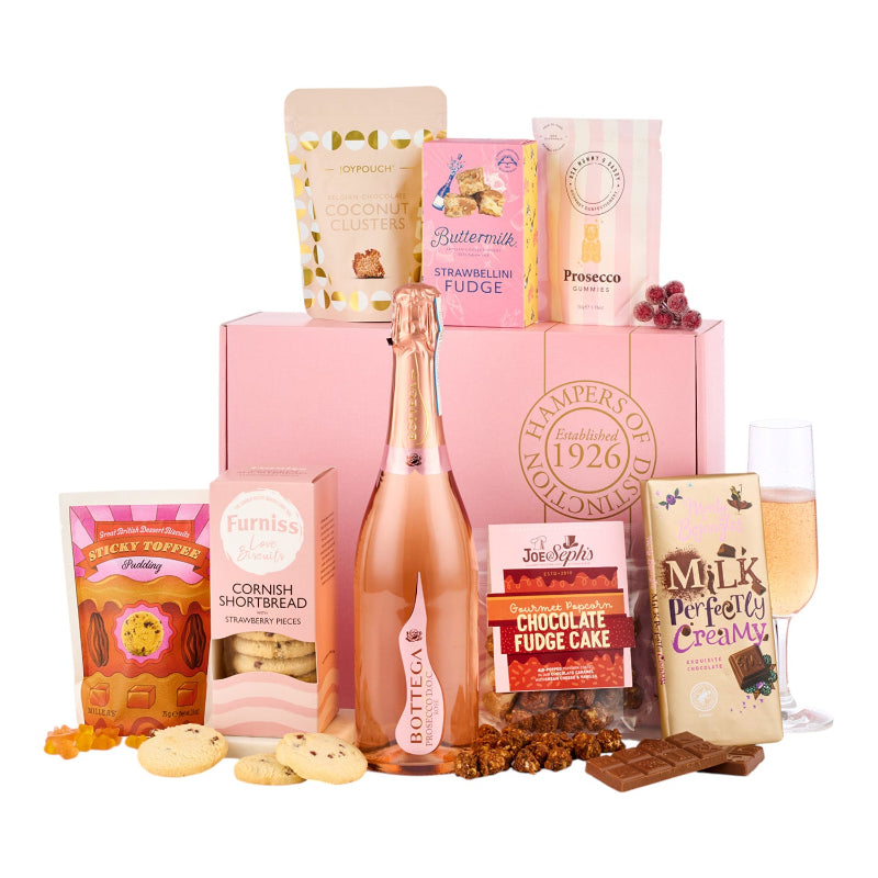 Elevate any celebration with this stunning gift box featuring elegant Rosé Prosecco and indulgent treats.