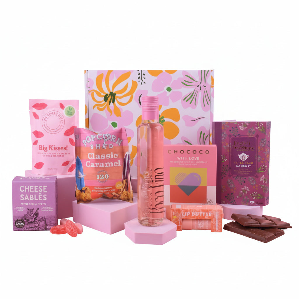 This luxurious selection is bursting with flavour and charm. Enjoy a crisp glass of Rosé, brew a soothing cup of English Tea Shop Sips of Calm tea, then savour a buttery cheese sable with cumin seeds or a handful of classic caramel popcorn. Enjoy the playful sweetness of sour strawberry and cherry gummies alongside a rich Chococo ‘With Love’ milk chocolate bar. To add a little pampering, we have included a nourishing SPF 50 passionfruit glow lip butter that leaves lips soft and refreshed. Every item has been chosen to create a relaxing and indulgent experience for the lucky recipient.