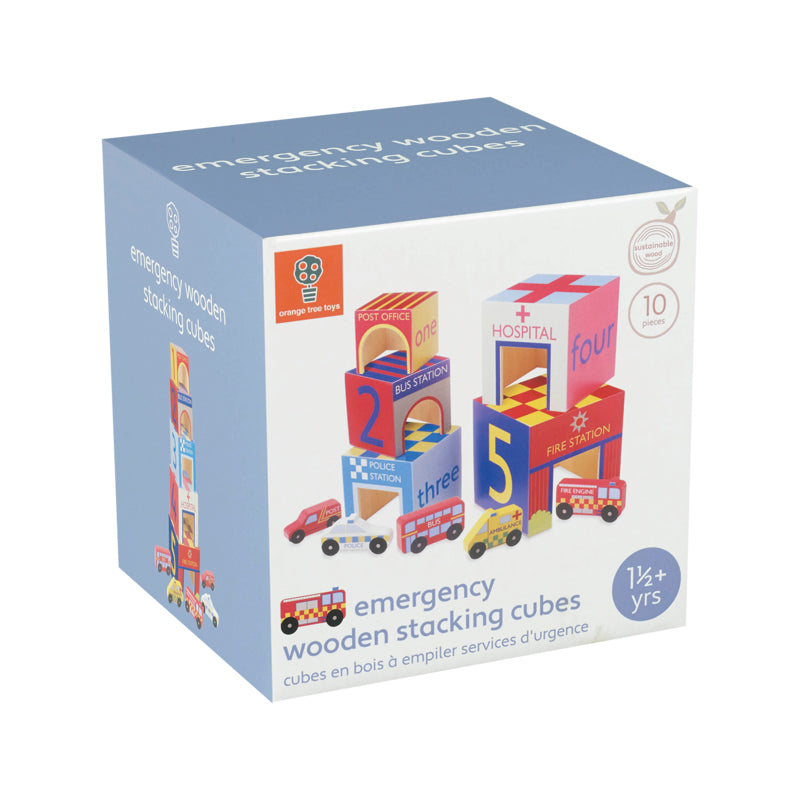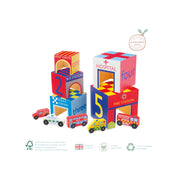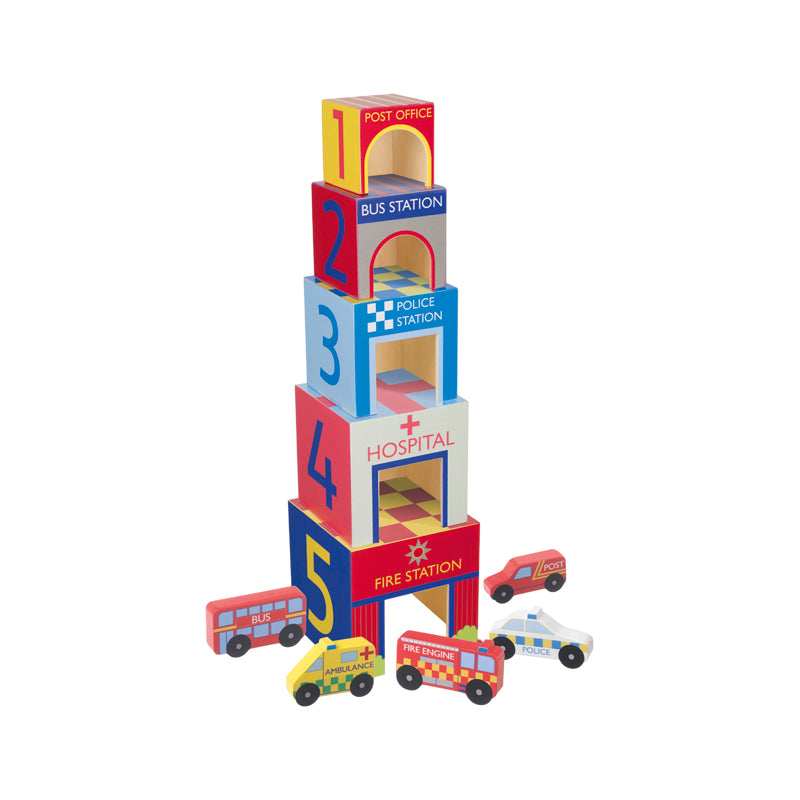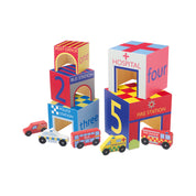 Each box is in the design of a different service building, and comes with a wooden vehicle, helping to encourage imaginative play. This set will also help children learn their first numbers.