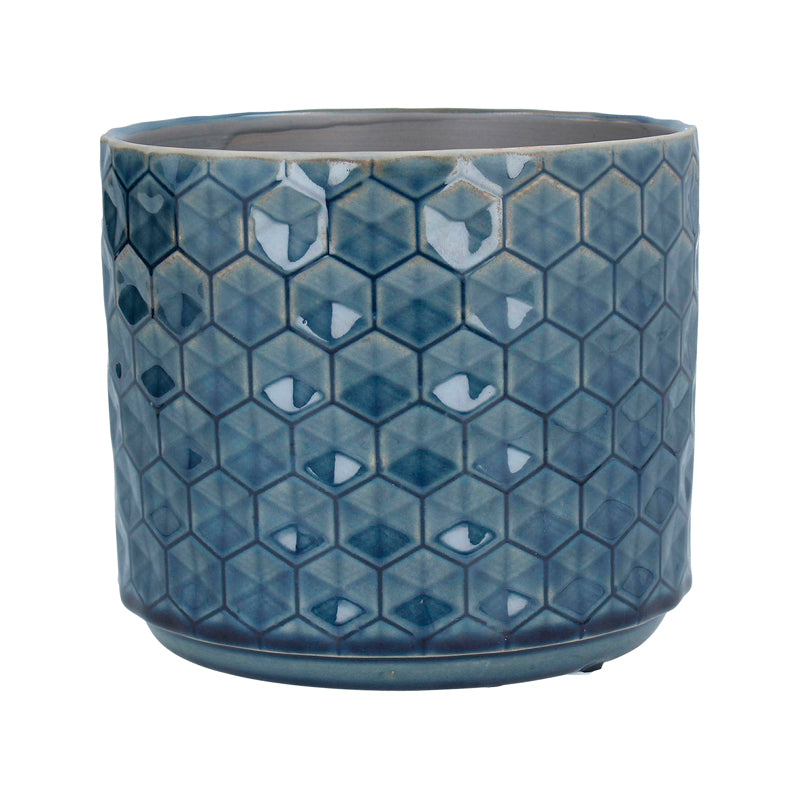 This stylish stoneware pot with honeycomb design in navy would look great in any room.